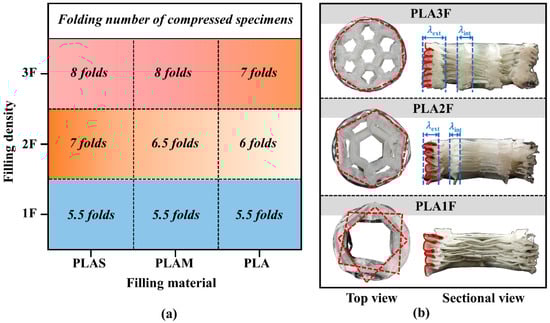 (a) Distribution of folding numbers for different filling densities and filling materials; (b) the top and sectional views of compressed PLA-filled structures with different filling densities.