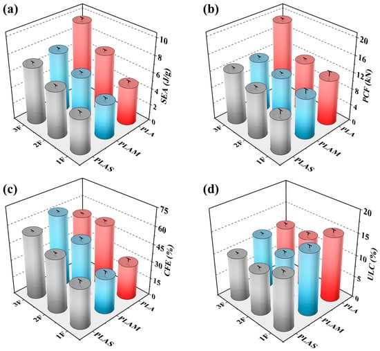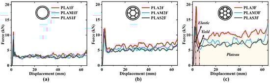 Next, the experimental curves will be discussed in groups. It was found that the force levels of three curves were relatively close, as shown in Figure 4a, while the force levels of three curves exhibited an obvious difference, as shown in Figure 4c. This could be attributed to the competing effects between the outer and inner tubes and the difference in material properties. For filled tubes with low filling density, the outer tube played a dominant role in the overall energy absorption, while the inner tube played a more passive role, as analyzed in Section 3.1. As a result, the force levels of PLA1F, PLAM1F, and PLAS1F were similar across different filling materials. Figure 4c shows that the effect of the inner tube enhanced as the filling density increased. The filling material became a crucial factor. PLA material was characterized by high strength, PLAS material had lower strength, and PLAM material exhibited intermediate strength. Therefore, the force levels of PLA3F, PLAM3F, and PLAS3F were significantly different and gradually decreased.