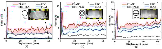 In order to investigate the interaction between empty beverage cans and multi-cell fillers at different filling densities, the compression behavior of three groups of specimens was studied. Figure 6a shows the load–displacement curves of the empty beverage can (EBC), the multi-cell tube made of PLA with density 1 (PLA1), the sum of the empty can and the multi-cell tube (EBC + PLA1), and the corresponding multi-cell-filled tube (PLA1F). The area between curves of EBC + PLA1 and PLA1F represents the synergistic effect of outer can and filler. As shown in Figure 6a–c, the force response levels of three filled tubes were improved owing to the synergistic effect. Notably, this effect in Figure 6a was very remarkable. For PLA1, after exceeding the initial peak, the force fell off rapidly and remained at a low level. From the crushing behavior at the 60 mm displacement, the PLA1 tube developed severe cracks due to brittleness and lost stability, exhibiting a Euler’s buckling mode []. In contrast, the EBC had a long loading plateau stage and exhibited relatively stable deformation during compression. As shown in Figure 3b, when PLA1 and EBC were combined, the latter played a dominant role in the overall deformation. Under circumferential constraint of EBC, the failure mode of PLA1 tube changed from Euler’s buckling to asymmetric diamond mode, and large cracked fronds transformed into regular plastic fold lobes. The result indicated that the standalone PLA tube with low density was not suitable for energy absorption due to severe fracture during folding, while this adverse effect could be avoided by adding outer metal cans []. The filled tube showed significantly improved energy absorption efficiency.