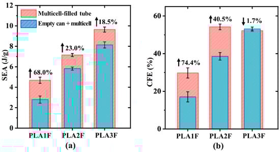 Figure 7 shows the impact of the synergistic effect on SEA and CFE. The SEA values of three filled tubes were improved compared to the sum of their corresponding components. However, as the filling density increased, this improvement diminished. The synergistic effect in PLA1F was the most significant, resulting in a 68.0% improvement in SEA. For CFE, PLA1F also showed noticeable enhancement, increasing by 74.4%. However, a negative synergistic effect was observed in PLA3F. This was because the inner tube of PLA3F had already exhibited stable progressive cracking failure, and the EBC with lower strength could not further improve the structural stability.