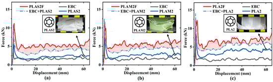 To compare the influence of the filling material on synergistic effect, Figure 8 shows the load–displacement curves of three groups of specimens. For three filling materials, their force response levels were higher than the sum of the corresponding components. The main reason was the generation of regular plastic folds and interfacial friction [,]. It was found that the multi-cell tubes developed irregular folds when compressed individually, especially for PLAS2 and PLAM2. However, when these tubes were filled into beverage cans, the constraints provided by the outer cans caused the multi-cell tubes to exhibit a more desirable deformation mode with regular plastic fold lobes, which was beneficial to energy absorption. Additionally, the curve fluctuation amplitude of PLA2F in the plateau stage was the largest among three filled tubes. This was because the PLA2F displayed many brittle cracks and fractures, corresponding to the large fluctuations in crushing force.