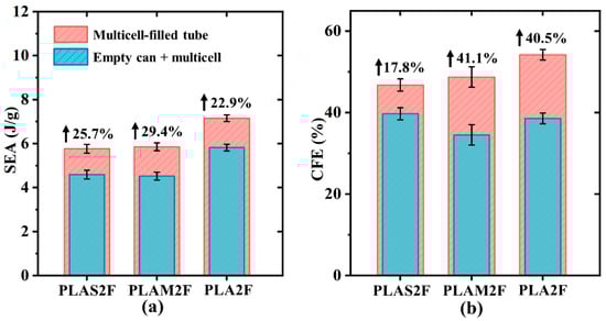 Figure 9 shows the impact of the synergistic effect on SEA and CFE at different filling materials. The improvement in SEA values was similar for the three filling tubes. For CFE, the improvement in PLAS2F was obviously lower than that of other tubes. This was because the PLAS material had excellent toughness but lower strength. The PLAS2 tube already showed a lower initial peak and good loading uniformity. As a result, the improvement in CFE of PLAS2F was limited.