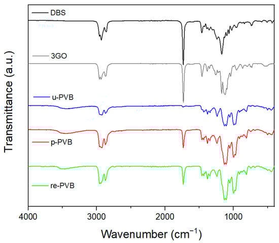 FT-IR spectra of the reference PVB materials (u-PVB, p-PVB, re-PVB) and the most common PVB plasticizers (DBS, 3GO).