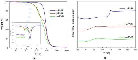 Turning to TGA analysis (Figure 2a, Table 2), unplasticized PVB exhibited a single-step mass loss curve, corresponding to the decomposition of PVB. On the contrary, p-PVB and re-PVB presented two different mass loss steps, with the first referring to the evaporation of the contained plasticizers. The slightly high residue of re-PVB (0.4% w/w higher than p-PVB) could indicate the presence of a small fraction of glass residue in comparison with p-PVB.