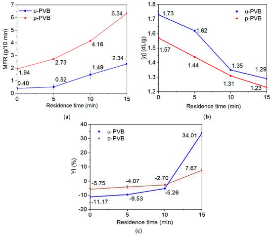 (a) Melt flow rate, (b) intrinsic viscosity [η], and (c) yellowness Index (YI) for u-PVB and p-PVB at different residence times.