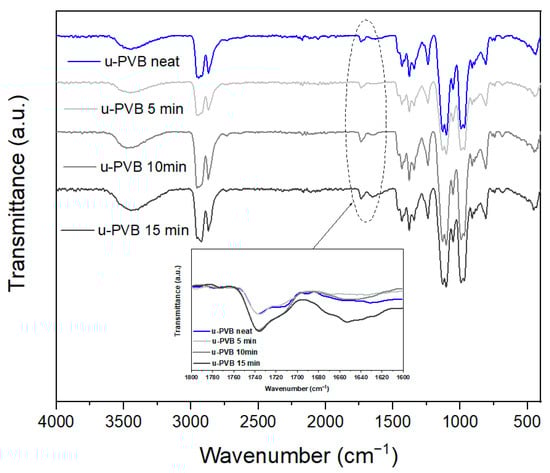 The thermally degraded products of u-PVB and p-PVB were also monitored by FT-IR analysis. Regarding u-PVB (Figure 4), no significant peak differentiations were observed, apart from the carbonyl region in the range of 1600–1800 cm−1. The peak therein corresponds to VAc, as explained in Figure 1, but a slight increase in its intensity with increasing processing time was observed, verifying the presence of new carbonyl species due to thermo-oxidative degradation. The spectrum change was evident but not as severe as that reported by El-Din and Sabaa [22]. Moreover, a new peak at ca. 1650 cm−1 appeared in the spectra of the 10- and 15-min processed samples, again assigned to degradation products (α,β-unsaturated ketones) as suggested by Grachev et al. [59]. This was not the case in the corresponding p-PVB samples (Figure S2), since on the one hand, the strong plasticizer peak overlapped at the same wavenumber range, while on the other hand, the lower suffered degradation due to the presence of the plasticizer might not result in the observation of new peaks.