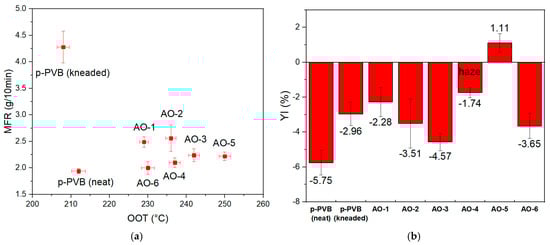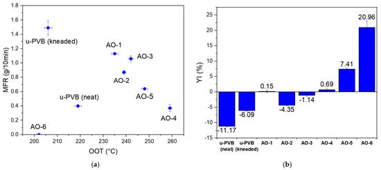 (a) MFR and OOT; (b) YI for the neat, unstabilized, and incorporated AOs (AO 1–6) for p-PVB in the critical condition of 10 min in the internal mixer.