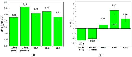 (a) MFR and (b) YI for the neat, unstabilized, and incorporated AO-3, AO-4, and AO-5 for re-PVB in the critical condition of 10 min, 40 rpm, 150 °C in the internal mixer.