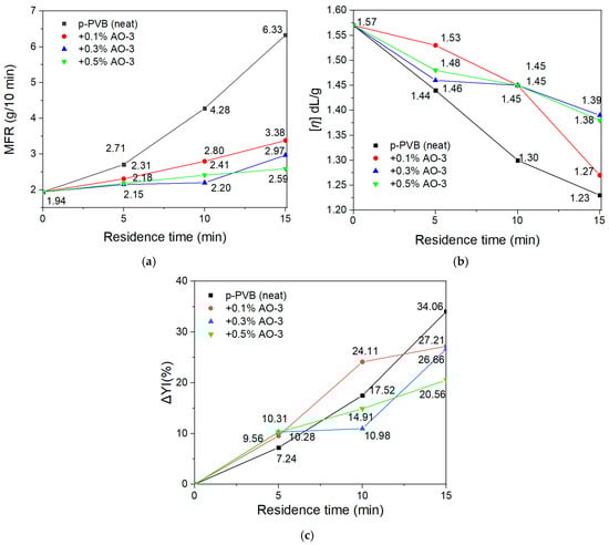 (a) MFR, (b) [η], and (c) YΙ for p-PVB with AO-3 at different concentrations (0.1%, 0.3%, 0.5% w/w) and residence times (0, 5, 10, 15) at 150 °C and 40 rpm in the internal mixer.