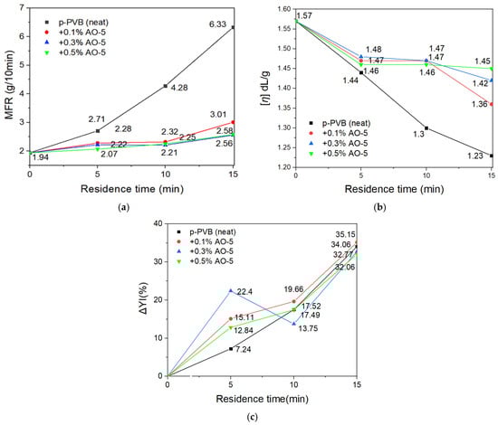 (a) MFR, (b) [η], and (c) YΙ for p-PVB with AO-5 at different concentrations (0.1%, 0.3%, 0.5% w/w) and residence times (0, 5, 10, 15) at 150 °C and 40 rpm in the internal mixer.