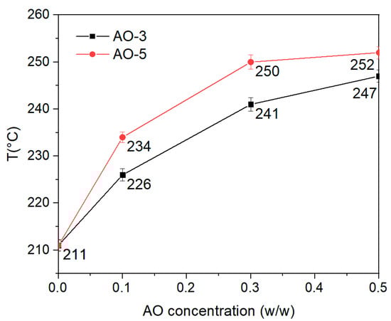 Additionally, the thermal oxidative stability of AO-3 and AO-5 was tested in the AO concentration study at the critical condition only (10 min, 150 °C and 40 rpm), proving that AO-5 not only performed better in MFR but provided better thermo-oxidative stability than AO-3 at all concentrations and residence times (Figure 10).