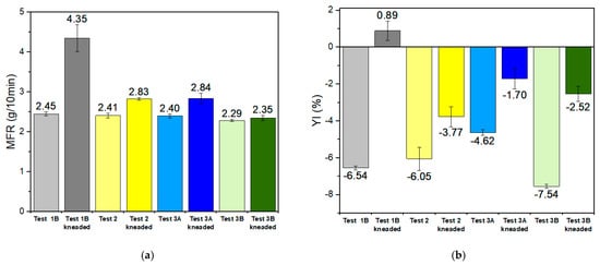 (a) MFR and (b) YI for Test 1B, Test 2, and Test 3B before and after being subjected to thermo-oxidative degradation in the internal mixer at 150 °C, 40 rpm for 15 min.