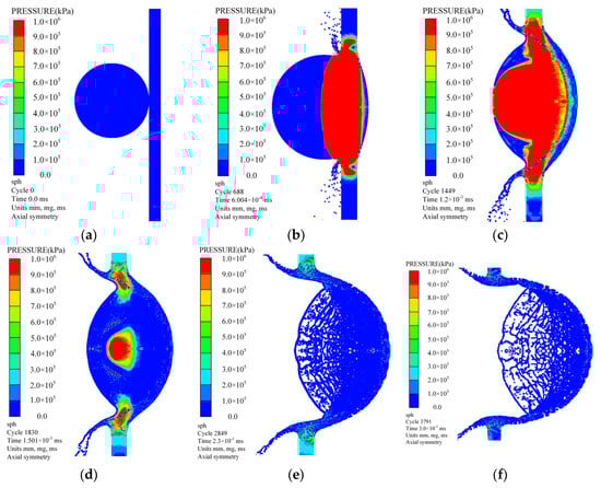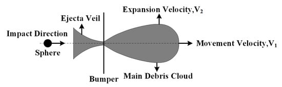 To study the development process of the sphere impacting the bumper, smoothed particle hydrodynamics (SPH) simulations were conducted using AUTODYN 2023 R1. SPH is a robust method for replicating hypervelocity impact scenarios. The shock equation of state, the Johnson–Cook strength model, and the Grady spall failure model were utilized to describe the bumper material Al 5A06 [