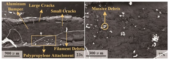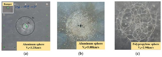 The results indicate that an increasing impact velocity leads to higher shock wave pressure generated by the sphere–target impact, resulting in larger bumper perforation, faster debris cloud velocity, and a larger damage area on the rear wall. Simultaneously, both the shock temperature and the residual temperature rise. At an impact velocity of 2.257 km/s, the shock temperature reaches 584.2 K, and the residual temperature is 452.6 K, both surpassing the melting point of polypropylene. This suggests that polypropylene undergoes a phase transition under these conditions, forming a ‘liquid filament’ like fluid debris cloud due to its unique intermolecular forces. As impact velocity increases, the sphere’s fragmentation and phase transition become more pronounced, producing smaller sphere fragments and more fluid debris. Consequently, the ‘groove’ type damage on the rear wall diminishes in size.