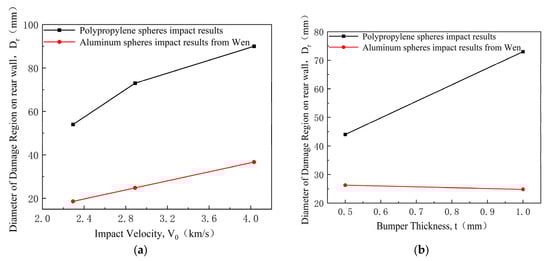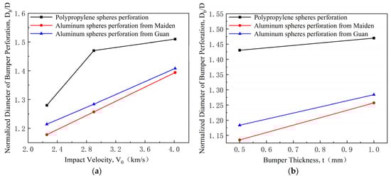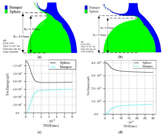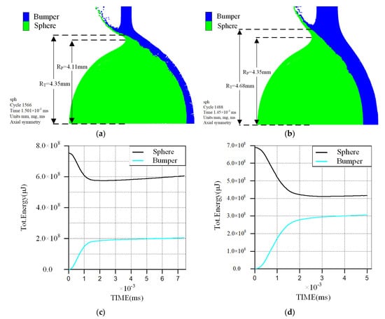 Figure 19a,b, it is evident that at the end of the first stage, the radial deformation radius of the polypropylene sphere is 4.35 mm, while that of the bumper impacted by the sphere and fragments is 4.65 mm. Conversely, the radial deformation radius of the aluminum sphere is 4.05 mm, and that of the bumper is 4.35 mm, both being smaller than those caused by polypropylene.