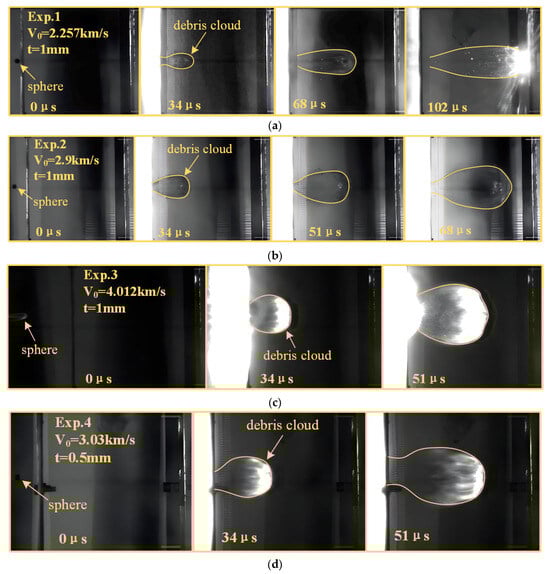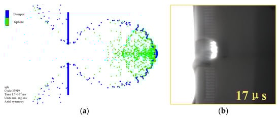 Figure 17 compares the simulation and experimental results at an impact velocity of 3.03 km/s, demonstrating a close match between the debris cloud morphology from the simulation and the experimental observations at 17 μs after impact.
