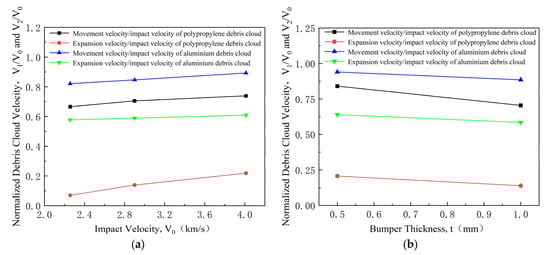 Figure 20 presents the results after the first stage of the polypropylene sphere impact under varying bumper thickness conditions. At an impact velocity of 3.03 km/s and a bumper thickness of 0.5 mm, the deformed radial radius of the polypropylene sphere is 4.11 mm, while the radial radius of the bumper, subjected to the impact of the sphere and fragments, is 4.35 mm. The energy transfer time of the sphere’s kinetic energy is approximately 2.1 μs, the stable energy of the target plate is about 180 J, and the energy transfer ratio is roughly 24.6%. For an impact velocity of 2.9 km/s and a bumper thickness of 1 mm, the deformed radial radius of the polypropylene sphere increases to 4.35 mm, and the radial radius of the bumper under the impact of the sphere and fragments reaches 4.68 mm. The energy transfer time of the sphere’s kinetic energy extends to about 2.8 μs, the stable energy of the bumper rises to approximately 293 J, and the energy transfer ratio increases to 42.5%. Under similar impact velocities, increasing the bumper thickness results in greater radial deformation of the sphere, prolonged interaction time between the sphere and the bumper, and a higher energy transfer ratio. This leads to a reduction in the residual energy of the sphere and an increase in the bumper’s energy at stability, ultimately enlarging the perforation size of the bumper and diminishing the velocity of the debris cloud.
