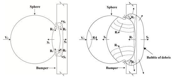 denote the rarefaction waves reflected from the sphere’s surface, the front surface of the bumper, the rear surface of the bumper, and the rear surface of the sphere, respectively. The intensity of these rarefaction waves is directly correlated with the intensity of the initial shock waves [