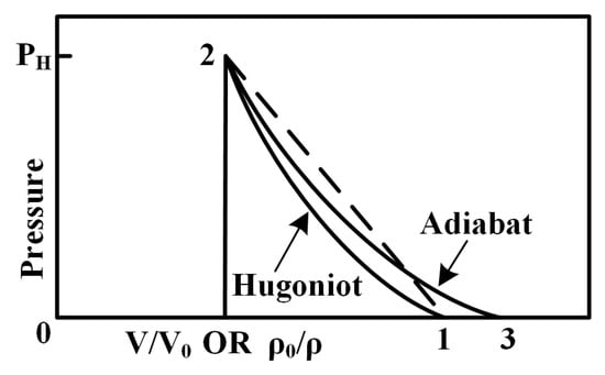 Figure 15, the loading process of the shock wave in the sphere and the bumper can be approximately regarded as adiabatic and non-isentropic, represented by the area enclosed by dashed line 1–2. The unloading process of the rarefaction wave, in contrast, can be considered adiabatic and isentropic, delineated by the area within curve 2–3. The difference between these areas signifies the increase in the material’s internal energy resulting from the shock wave’s loading and unloading processes. This energy increase raises the material’s temperature, leading to phase transitions once a critical temperature threshold is reached [
