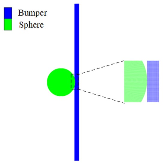 In the above simulation model, the materials of the sphere and the bumper are considered to be ideal, homogeneous, and isotropic materials. These materials are assumed to have no internal defects, and their mechanical properties are uniform in all directions. The impact environment is an ideal vacuum. During the impact process of the sphere and the bumper, there is no heat exchange between the material and the environment. Additionally, the influence of the bumper boundary on the propagation characteristics of the internal shock wave is neglected.