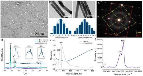 TEM image of AgNW (a); HRTEM image of AgNW, AgNW length and AgNW diameter histograms (b); selective area electron diffraction (SAED) (c); X-ray diffraction (XRD) (d); UV–Vis absorption spectra of AgNW and PEDOT:PSS (e); Raman spectra of AgNW (f).