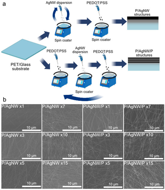 We used the spin-coating technique to create PEDOT:PSS/AgNW composite films. Spin-coating is popular a technology used to create uniform thin films with a thickness of micrometers and nanometers [33]. We have two options for composite film formation. The first is to deposited AgNW, then deposited PEDOT:PSS. This will result in a bilayer structure, which we named by the abbreviation P/AgNW. The second method is layer-by-layer alternation of AgNW and PEDOT:PSS. As a result, we will obtain a multilayer composite film, which we named by the abbreviation P/AgNW/P. A schematic representation of the sample preparation is shown in Figure 2a.