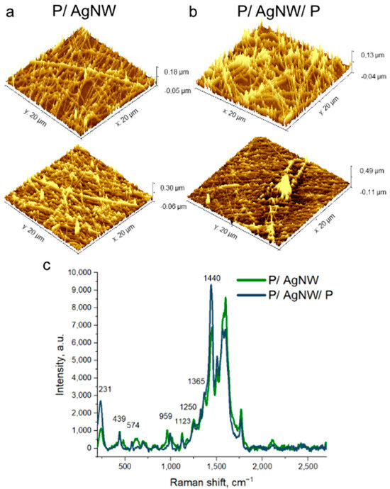 AFM-images of P/AgNW composite films obtained by 5 deposition iterations (top picture) and 15 deposition iterations (bottom picture) (a); P/AgNW/P composite films obtained by 5 deposition iterations (top pictures) and 15 deposition iterations (bottom pictures) (b); Raman spectra of P/AgNW and P/AgNW/P films (c).
