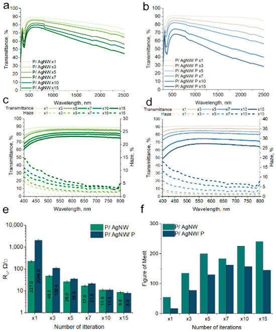 Figure 4c,d shows the optical Transmittance and Haze in the visible range for the P/AgNW and P/AgNW/P composite films. The Haze value shows the ratio of diffuse light Transmittance to total light Transmittance. Since our P/AgNW and P/AgNW/P composite films represent a network of randomly arranged AgNW covered by PEDOT:PSS, they scatter incident radiation [39]. Haze spectra tend to increase with decreasing wavelength. Increasing the density of AgNW in the film leads to an increase in Haze. For example, for P/AgNW films, Haze increases from 0.71% (×1) to 6.54% (×15) at a wavelength of 550 nm. For P/AgNW/P films, Haze increases from 0.31% (×1) to 9.22% (×15) at a wavelength of 550 nm. Haze has a critical dependence on the AgNW diameter [40] and their surface density. The difference in the Transmittance and Haze between the P/AgNW and P/AgNW/P composite films is due to the peculiarities of the film formation methods. As we have already mentioned earlier, P/AgNW composite films are created by layer-by-layer deposition of AgNW and then deposition of PEDOT:PSS on top of these AgNW. With this method, the effect of saturation of the AgNW surface density occurs. In this method, the excess AgNW will be swept away from the substrate surface during spin-coating. The effect of saturation of the surface filling factor is observed for P/AgNW composite films, the Transmittance and Haze of the composite films change disproportionately to the number of deposition iterations.