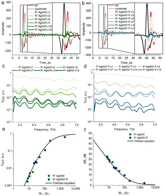 Time waveforms of THz pulses for P/AgNW (a) and P/AgNW/P composite films (b); Transmittance spectra in the range of 0.1–1 THz for P/AgNW (c) and P/AgNW/P composite films (d); dependences of average Transmittance on the sheet resistance value (e); dependences of SE on the sheet resistance value (f).