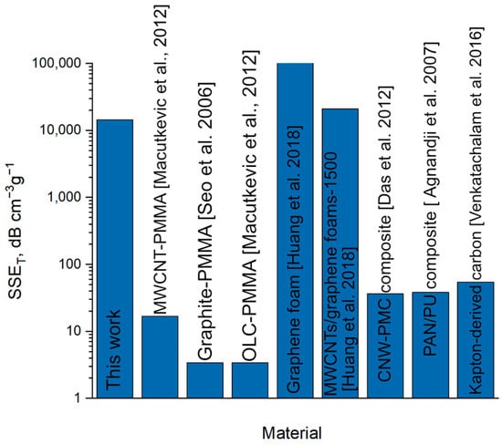 To highlight our results, we compared specific shielding efficiency (SSET) with other materials. SSET is a parameter that takes into account the density of the material and its thickness. It is calculated using the following formula: