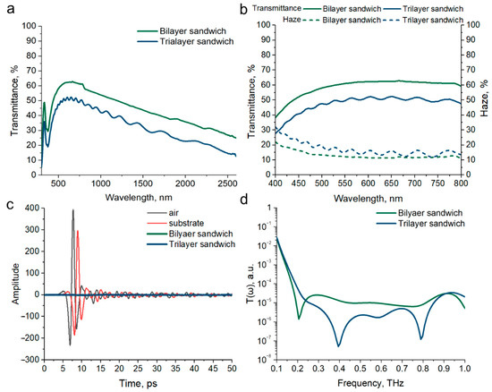 Transmittance bi- and trilayer sandwich structures based on P/AgNW composite films in the range of 300–2600 nm (a); optical Transmittance and Haze spectra bi- and trilayer sandwich structures based on P/AgNW composite films in the visible range (b); time shapes of THz pulses transmitted through bi and trilayer sandwich structures (c); Transmittance spectra bi- and trilayer sandwich structures in the range of 0.1–1 THz (d).