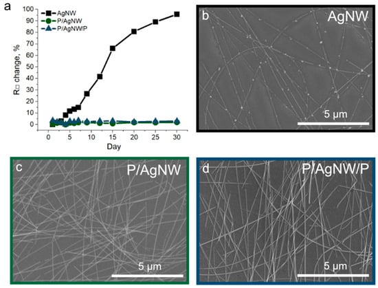 At the same time, the P/AgNW and P/AgNW/P composite films were not subjected to corrosion, and their sheet resistance remained the same (there is a scatter associated with the measurement error). The absence of the atmospheric corrosion process is also confirmed by the SEM image of P/AgNW (Figure 8c) and P/AgNW/P (Figure 8d) composite films.