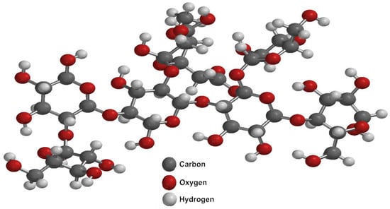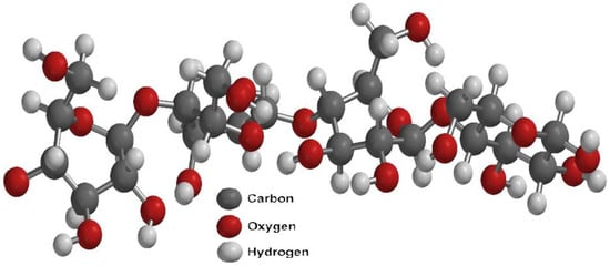 Lignocellulosic biomass, also known as natural cellulosic fibers, consists of plant derived materials from cell walls, primarily composed of cellulose (40–50%), hemicellulose (25–30%), and lignin (15–20%), along with minor components like pectin, proteins, salts, and minerals [73,74,75,76]. Cellulose, the main structural component, provides rigidity to plant cells and is the most abundant renewable polysaccharide on Earth [77,78]. Its microfibrils, composed of 500–1400 D-glucose units linked by β-1,4 glycosidic bonds, exhibit a semicrystalline structure with crystalline and amorphous domains [29,79,80,81]. Figure 2 shows the chemical structure of cellulose.