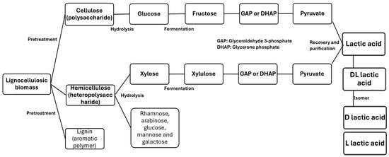 The organic nature of lignocellulosic biomass makes it valuable through two main biotechnological conversion routes: (i) sugar hydrolysis and fermentation, and (ii) carboxylic acid production via anaerobic fermentation [10,15]. When lignocellulosic biomass is valorized through sugar hydrolysis, most fermentative microorganisms can readily convert glucose into biofuels and biochemical products, such as bioethanol and lactic acid, among others [57,106,107]. In anaerobic fermentation for carboxylic acids, such as lactic acid, research focuses particularly on optimizing traditional anaerobic bioprocesses dedicated to biogas or carboxylate production [108,109]. Therefore, lignocellulosic biomass serves as an excellent source for lactic acid and other products due to its composition, which is rich in fermentable carbohydrates, and its abundance as a renewable resource. The use of specific microorganisms also enhances sustainability and waste reduction, making it key for eco-friendly industrial processes. Figure 5 shows a flow diagram of the general process for obtaining lactic acid from lignocellulosic biomass.