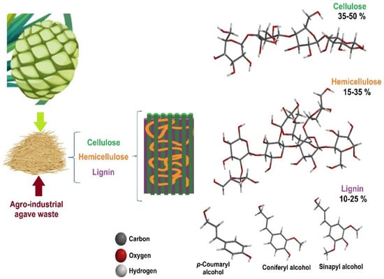 Cellulose accounts for 40–50% of the agro-industrial by-product [126]. Hemicellulose comprises various carbohydrates, including xylose, arabinose, galactose, mannose, glucose, and uronic acid, connected through glycosidic bonds, representing 25–30% of the by-product [113,126]. Lignin is a complex aromatic polymer and constitutes 15–20% of the residue [126,130]. Xylan is a polysaccharide consisting of a linear chain of xylose residues, while glucan is formed by D-glucose monomers [131]. Figure 6 illustrates the structure of agave biomass.