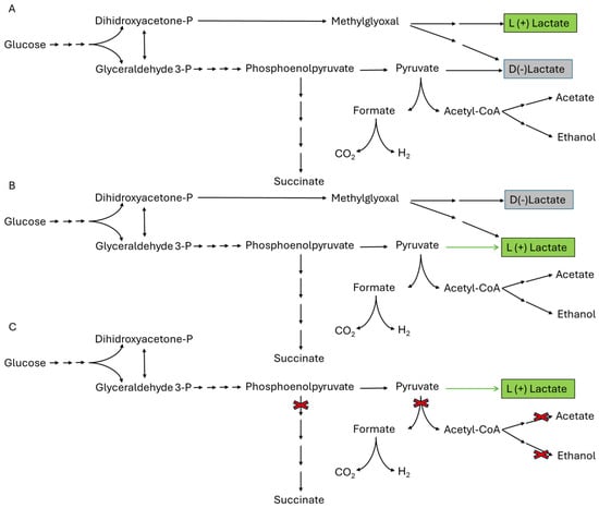 Wild-type Escherichia coli is capable of growing and producing lactic acid using hexoses and pentoses via fermentation, resulting in a mixture of organic acids (acetic acid, succinic acid, and formic acid) and ethanol [21,137] (Figure 7A). Additionally, it can grow in media with simpler nutrient requirements compared to conventional lactic acid bacteria. Other advantages of using E. coli for lactic acid production are the large number of genetically modified strains that currently exist, which offer great versatility in terms of the use of substrates, in addition to the in-depth knowledge of its genome and genetic regulation; and the wide variety of tools and techniques for its genetic modification, which allows for relatively easy rational genetic modifications, compared to other microorganisms. Genetically modified E. coli strains show enhanced lactic acid fermentation efficiency compared to wild-type E. coli strains [59,138]. These genetically modified strains have been engineered through (i) replacing the D-LDH gene with L-LDH from lactic acid bacteria, bovine sources, and other sources (Figure 7B). (ii) Preventing the synthesis of racemic mixtures of D- and L-lactate by bypassing the methylglyoxal pathway, thus preventing its accumulation (Figure 7C). (iii) Blocking the aerobic L-LDH to avoid the unwanted utilization of L-lactate or blocking the carbon flux to other fermentation products such as ethanol, succinic, formic, and acetic acids (Figure 7C).