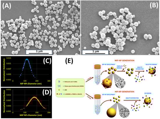 SEM images of the synthesized polymeric nanoparticles. (A) Non-imprinted polymer (NIP) nanoparticles, serving as control particles without specific recognition sites, and (B) molecularly imprinted polymer (MIP) nanoparticles (NPs), hosting structured recognition sites templated for S(-)-limonene. (C,D) Plots illustrate the respective normalized distributions of NIP- and MIP-NP diameters calculated from 100 samples. (E) Schematic representation of the development of MIP nanoparticles based on MAA and EGDMA, designed for specific terpenes, here, S-Lim. The process also includes the preparation of non-imprinted particles (NIP) as control samples, lacking the molecular imprinting of the target analyte.