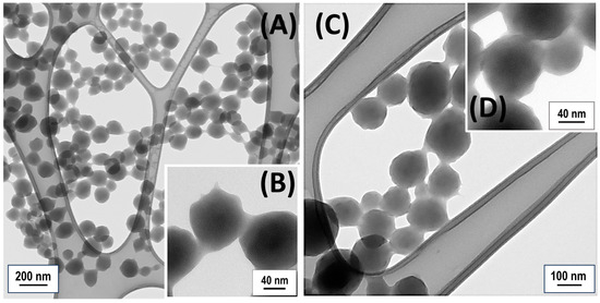 Transmission electron microscopy (TEM) micrographs showing NIP-NPs drop-cast onto a TEM grid at varying magnifications (A,B) and MIP-NPs (C,D).