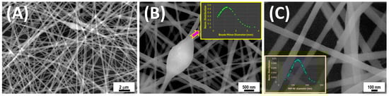 (A) SEM images of MIP-NPs collected on a silicon wafer, displayed at progressively higher magnifications in (B,C). Panel (B) highlights a single nanobead structure, while panel (C) showcases the details of the nanofiber architecture. The inset in (B) presents the normalized minor diameter distribution of approximately 50 beads, whereas the inset in (C) illustrates the diameter distribution of 100 nanofibers.
