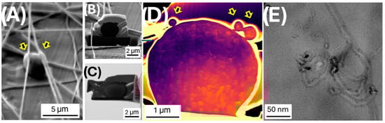 SEM micrographs of (A) the region of interest for the FIB cut and milling, (B) the first FIB cut, and (C) the final lamella. (D) False color (to highlight the details) of SEM-STEM image in dark mode and (E) STEM (by TEM measurement) of the lamella. Yellow arrows indicate the fibers above the bead and their location in the section.