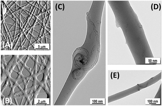 The shape and distribution of MWCNTs are evident in the TEM micrographs (Figure 5C–E). The dispersion of MWCNTs in DMF was optimized through sonication processes in combination with MIP-NPs and PVP solution to ensure a uniform distribution within the electrospun fibers, which is critical for enhancing the sensor’s performance. The nanotubes resulted dispersed throughout the fibers in various configurations: (i) aligned longitudinally with the fiber axis (Figure 5D), (ii) forming spiral structures (Figure 5C), and (iii) wrapping around the fibers in a spring-like arrangement (Figure 5E). Typically, the dispersion state of carbon nanotubes in the electrospinning solution is reflected in their distribution within the fibers [79]. The alignment of MWCNTs within electrospun polymer nanofiber composites is influenced by the forces involved in the formation of nanofibers in the electrospinning process, like electrostatic forces and strong shear forces during the elongation process, as also observed in the case of nanowire alignment within nanofibers [88]. Besides, it is heavily dependent on the stability of the carbon nanotube dispersion in the solution [89]. Factors such as solution viscosity, flow rate, type of collector, solvent, and the interactions among the polymer, nanoparticles, and nanotubes all play significant roles in this process [90]. Furthermore, inherent structural defects, like polymer dislocations and vacancies, may cause irregularities in the configuration of nanotubes in the nanofibers [91]. In addition to all the aforementioned factors, the different configurations observed are also due to the presence of MIP-NPs in the electrospinning solution, which could affect nanotube dispersion all along the nanofibers, thus altering their arrangement therein. An evident example of the possible interaction between MWCNTs and MIP-NPs is the spiral configuration of the MWCNTs displayed in Figure 5C, where the nanotubes seem to tangle around a globose object that appears as an MIP-NP aggregate. Evidence of interactions between MIP-NPs and MWCNTs is also visible in Figure 4E.