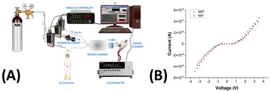 The measurement setup is illustrated and described in Figure 6A. To quantify and better understand MIP–MWCNT–PVP interactions, current–voltage (I–V) curves were investigated. The MIP- and NIP-NF-coated IDEs’ current–voltage (I–V) curves, carried out at 55% RH and T: 25 °C, are shown in Figure 6B. The plot revealed nonlinear shapes for both the chemiresistors.