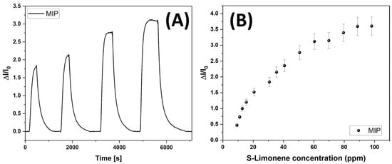 Transient responses of the MIP-NF sensor to increasing concentrations of S-Lim vapors (ranging between 30 and 60 ppm) (A). Sensor response curve to S(-)-limonene from 10 to 100 ppm. All data were provided at 55% of relative humidity (B).