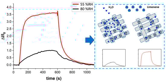 About the kind of electrical signal generated by S(-)-limonene adsorption, some authors reported that including limonene as a dopant in a polyelectrolyte matrix enhances ionic conductivity due to interactions between the methyl and methylene groups of limonene (acting as electron donors) and the matrix, which improves ionic mobility and thus increases conductivity [102]. Therefore, adding limonene as an additive not only increases ionic conductivity but also reduces bulk resistance, creating additional conductive pathways within the polymer matrix [103]. In this study, the presence of hydroxyl groups from MAA and EGDMA, along with UV-crosslinking in the air (which may ionize the carbonyl groups of PVP), likely contributed to the observed increase in conductivity in the presence of limonene.