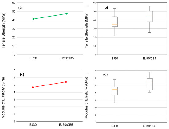 Comparative visualization of the average values, with tensile strength (a) and elastic modulus (c) for the EJ30 and EJ30/CB5 samples, alongside box-and-whisker plots for tensile strength (b) and elastic modulus (d) for the EJ30 and EJ30/CB5 composites.