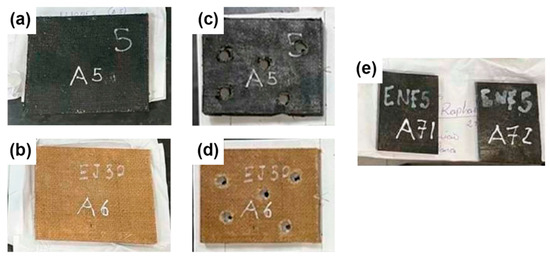 Figure 4 shows the EJ30 and EJ30/CB5 samples before and after the ballistics tests (Figure 4a,c for EJ30/CB5; Figure 4b,d for EJ30; and Figure 4e for E/CB5). The samples showed adequate spacing between impact sites, and the addition with CB produced a color change from beige (EJ30) to black (EJ30/CB5). Similarly, the E/CB5 samples exhibited a color change to black following the addition of carbon black, consistent with the EJ30/CB5 samples. However, the E/CB5 samples lacked structural integrity after ballistic impact, which was attributed to the absence of reinforcement by the jute fabric, which prevented the recovery of their fragments.