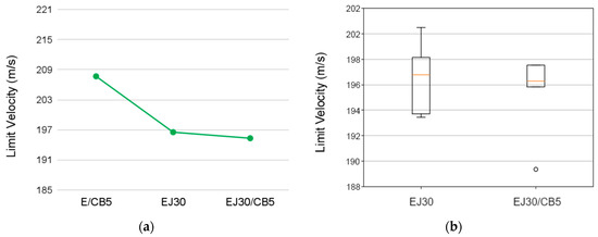 Comparison plots showing (a) the mean limit velocity values for the neat epoxy, EJ30, and EJ30/CB5 samples and (b) box-and-whisker plots for the limit velocity values of the EJ30 and EJ30/CB5 samples.