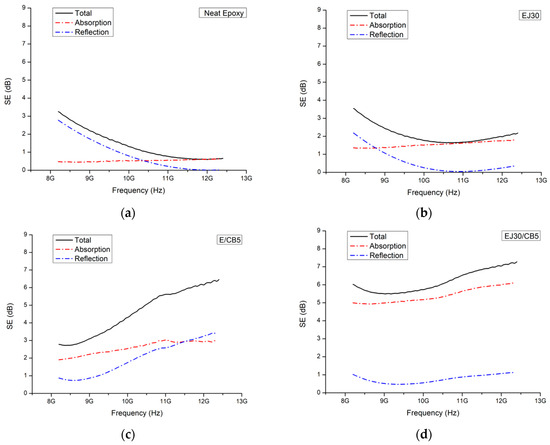 Shielding effectiveness (SE) for the (a) neat epoxy, (b) EJ30, (c) E/CB5, and (d) EJ30/CB5 samples.