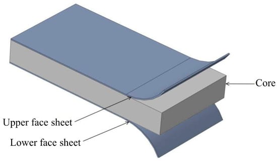 Designed to attain minimal weight with maximum stiffness, composite sandwich structures represent a practical solution to various engineering problems. Generally, as illustrated in Figure 1, sandwich structures comprise two surface face sheets connected to a low-density core [1]. The face sheets can be classified based on the material they are made from and include fiber-reinforced plastic (FRP) laminates, fiber metal laminates (FMLs) and metals [2,3,4,5,6], while the core can be made using a foam pattern, honeycomb structure or balsa wood; it can also be functionally graded [7,8,9,10].