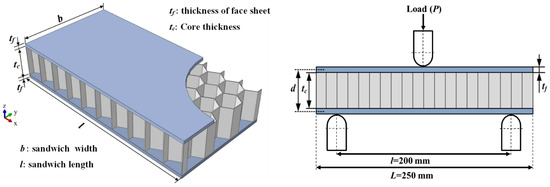 The sandwich structure consisting of WCFRP-laminated face sheets combined with a Nomex honeycomb core was investigated (Figure 7). To provide the required strength in the core–face sheet connection regions, an epoxy adhesive was applied between the core and face sheets.